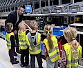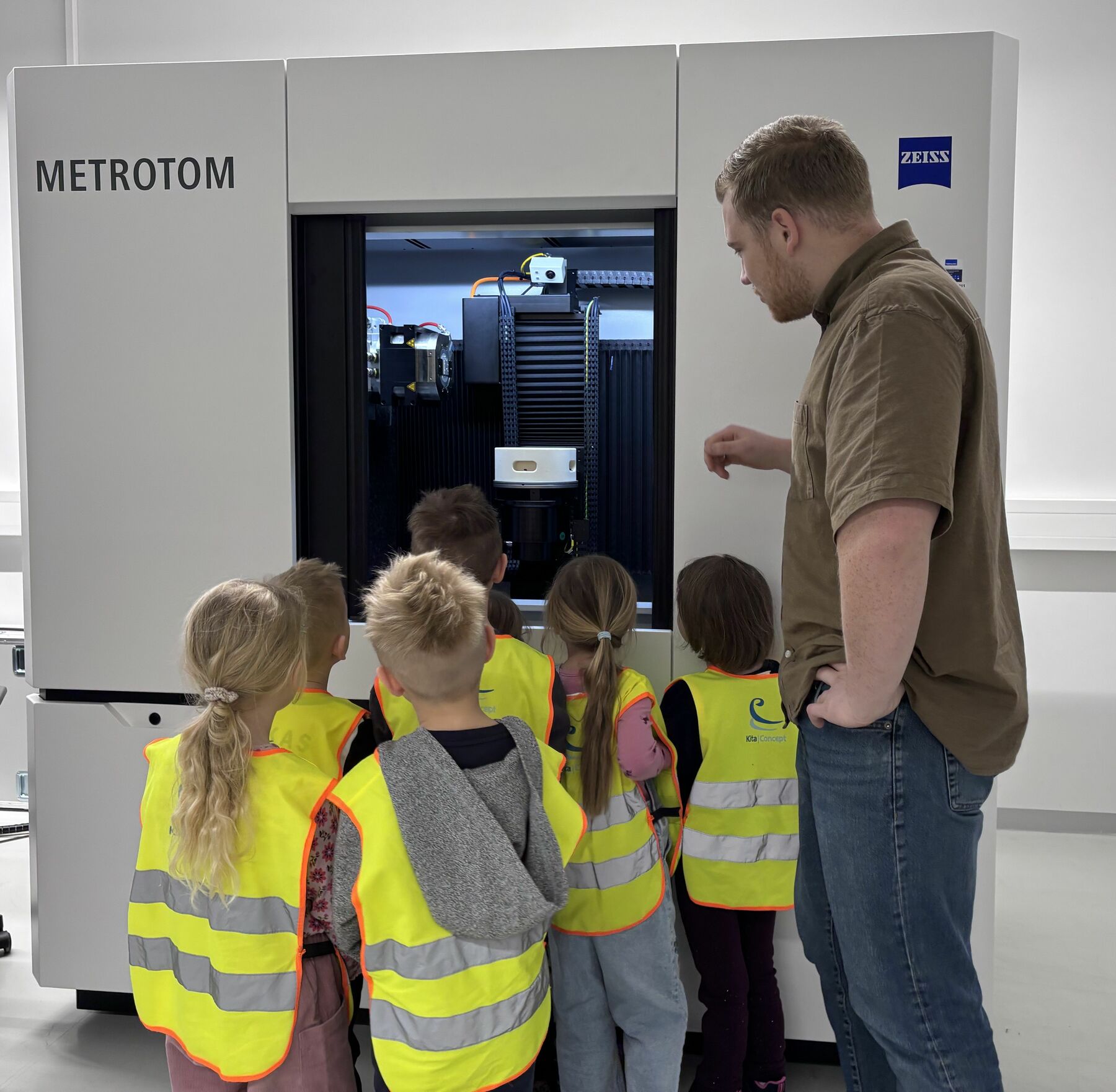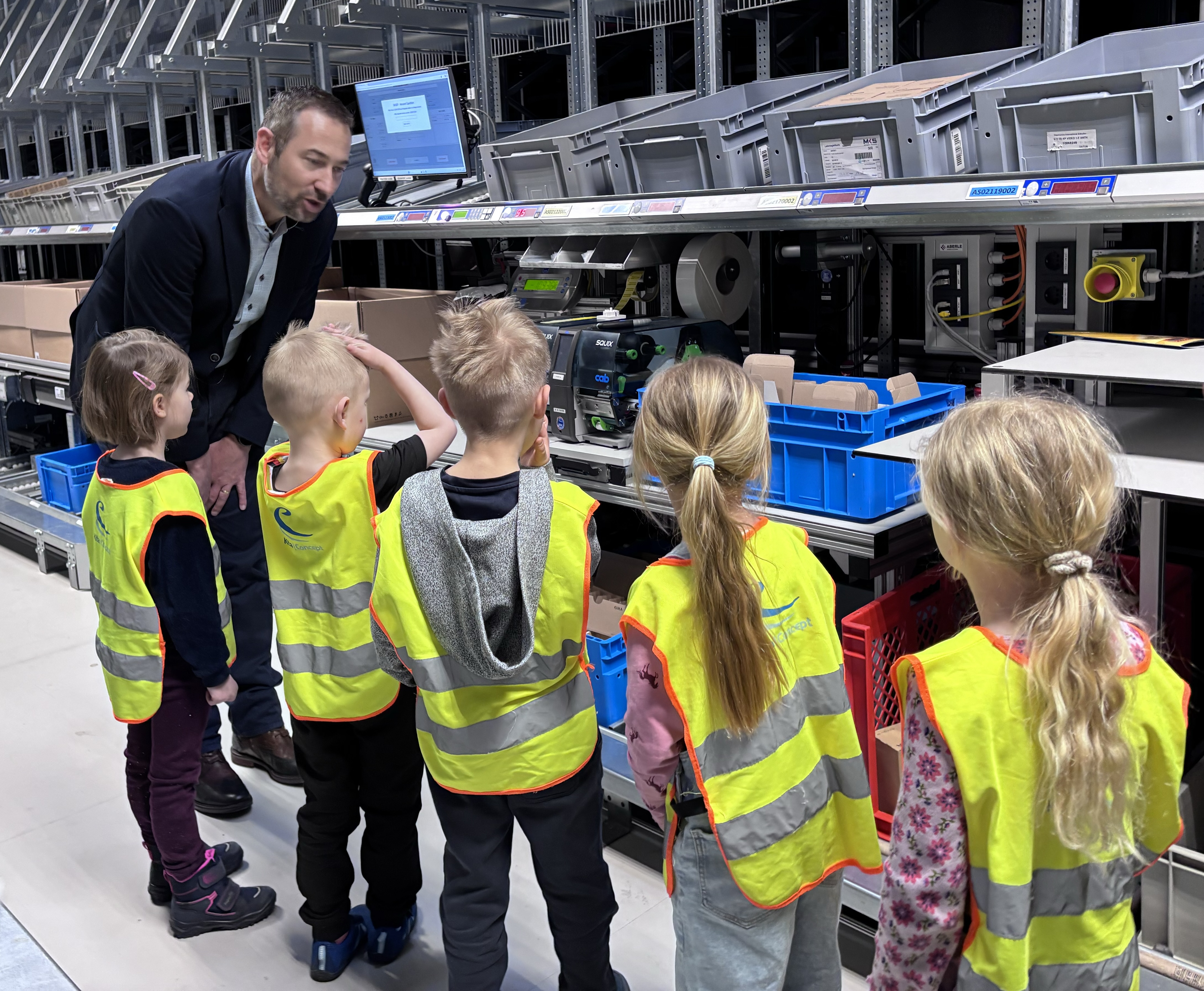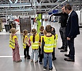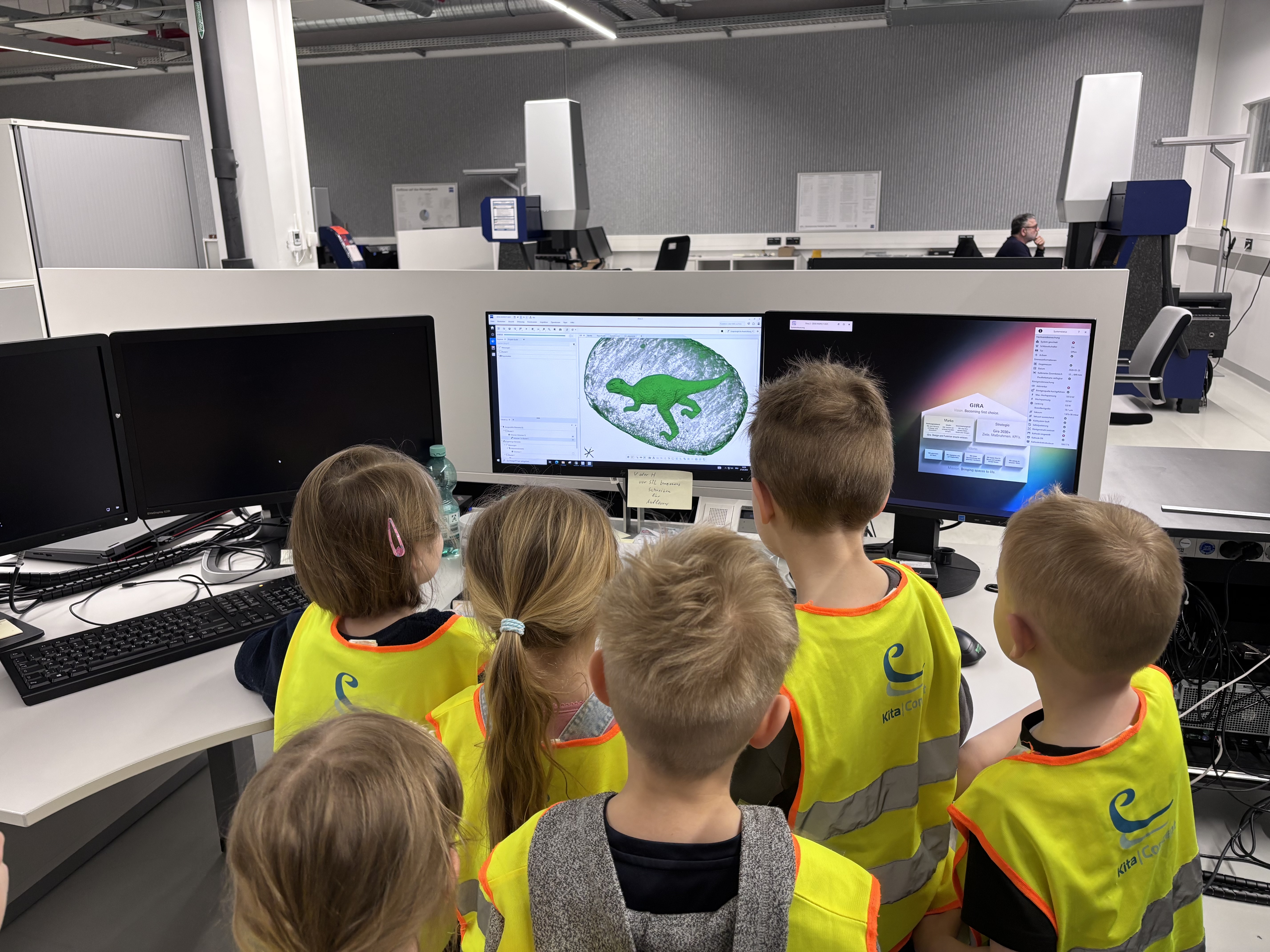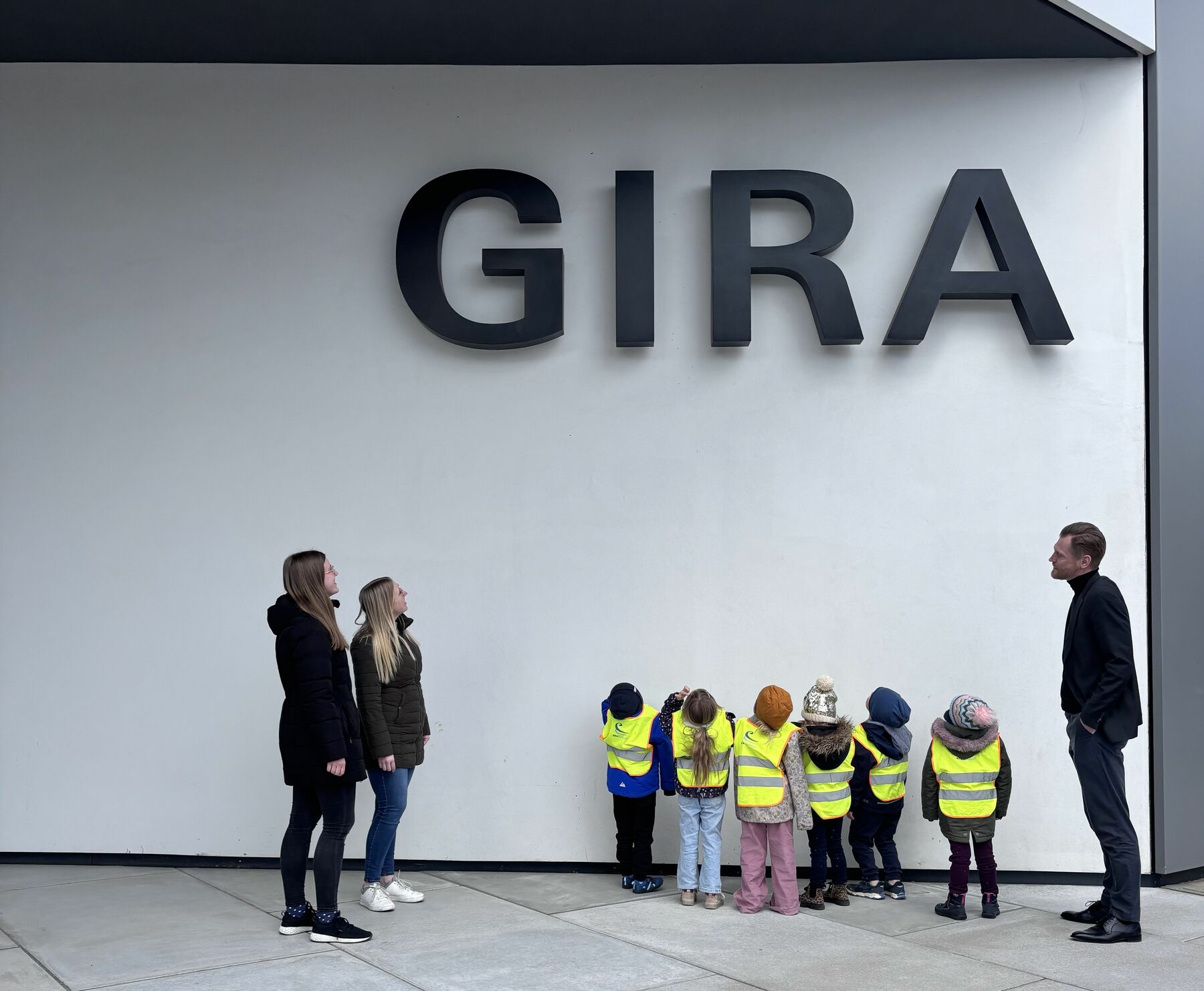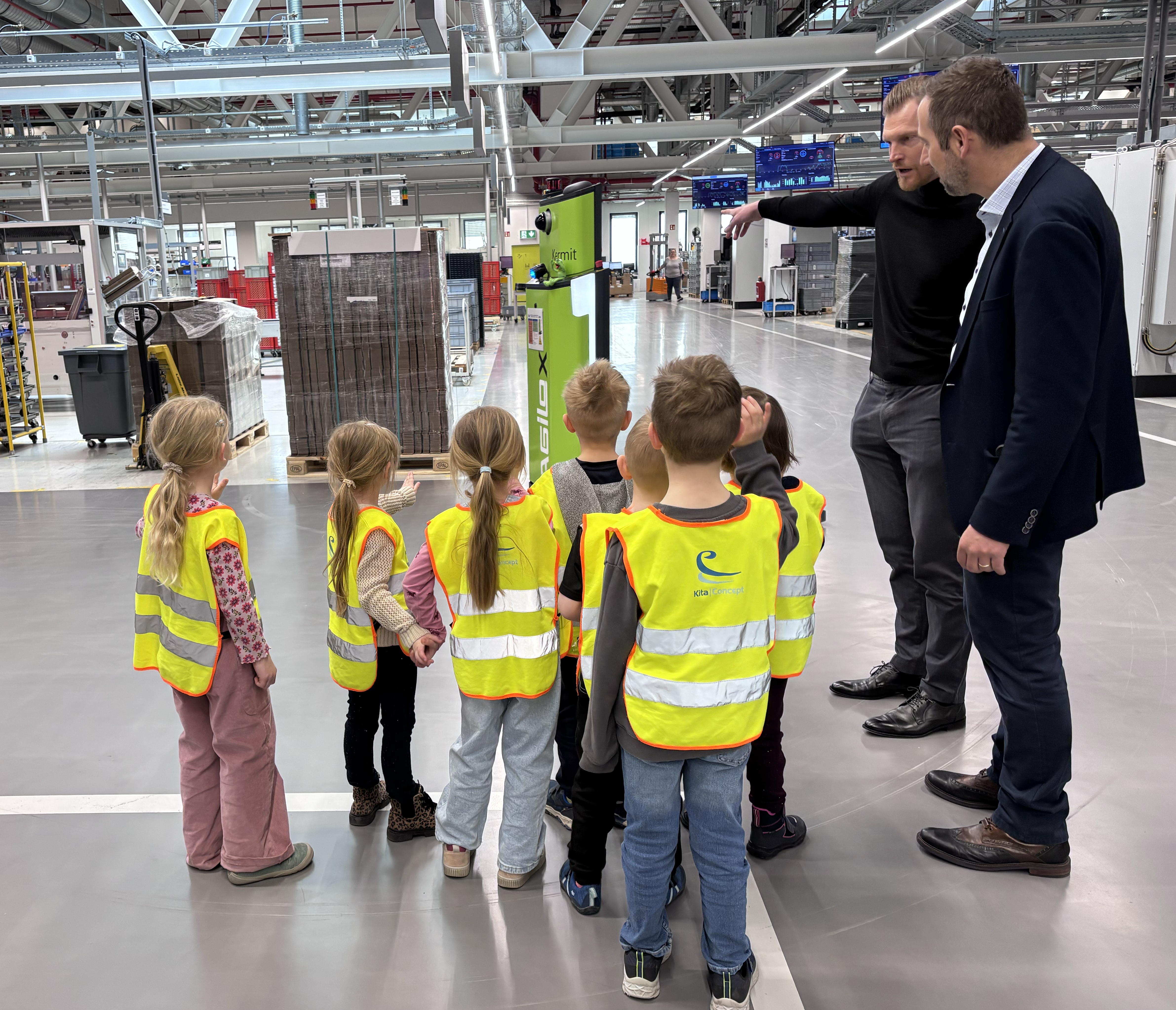 Radevormwald, 9. April 2026. Besonderen Besuch empfingen Dominik Marte und Sebastian Marz, Geschäftsführer des Gebäudetechnikspezialisten und Smart-Building-Pioniers Gira (www.gira.de), gemeinsam mit zahlreichen Kolleginnen und Kollegen kurz vor Ostern im Produktions-, Entwicklungs- und Logistikzentrum des Unternehmens an der Röntgenstraße in Radevormwald. Sechs Vorschulkinder aus der Gira Kita hatten sich gemeinsam mit ihren Erzieherinnen auf Entdeckungsreise durch die hochmoderne Montage, das Lager und den Versandbereich des Familienunternehmens begeben. Die beiden Geschäftsführer ließen es sich nicht nehmen, die jungen „Forschergiraffen“ auf ihrer Tour zu begleiten. Halt machten die drei Mädchen und drei Jungen an zahlreichen Arbeitsplätzen, an denen Gira Mitarbeitende zeigten und erklärten, was sie dort tun. Besonders spannend war ein Stopp im Labor der technischen Qualifizierung, wo im Computertomografen, mit dem normalerweise Bauteile und Muster überprüft werden, ein „Dino-Ei“ durchleuchtet wurde. Kennen gelernt haben die sechs Jungforscherinnen und -forscher ebenso „Kermit“ und „Yoda“, zwei autonome, batteriebetriebene Transportfahrzeuge, die vollautomatisch Routinelieferfahrten zwischen Lager und Montage durchführen. Genauso aufregend war für den Nachwuchs, eine der vielen Tausend grauen Gira Transportkisten zu verfolgen, die wie von Geisterhand gesteuert ihren Inhalt über Fließbänder vom Wareneingang bis an einen Montagearbeitsplatz in der Just-in-time-Fertigung gebracht hat. „So konnten die Mädchen und Jungen auf spielerische Art und Weise, erste Einblicke in die Arbeitswelt ihrer Eltern bekommen und die eine oder andere spannende Entdeckung für sich machen“, erklärte Geschäftsführer Sebastian Marz. „Die leuchtenden Kinderaugen haben gezeigt, wie gut der Ausflug bei ihnen angekommen ist“ Dazu beigetragen hat sicher auch das abschließende gemeinsame Mittagessen mit leckerem „Piratenteller“ und einem großen Eis.